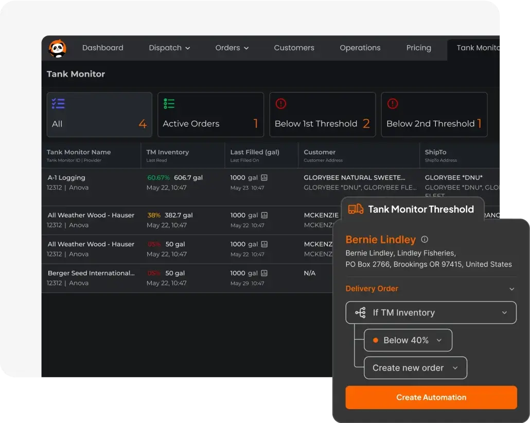 FleetPanda auto-creates orders when the tank monitor value reaches the custom threshold you set. Prevent run-outs and uphold keep-fill contracts with ease. We currently integrate with 8 tank monitor vendors, check out the details here.